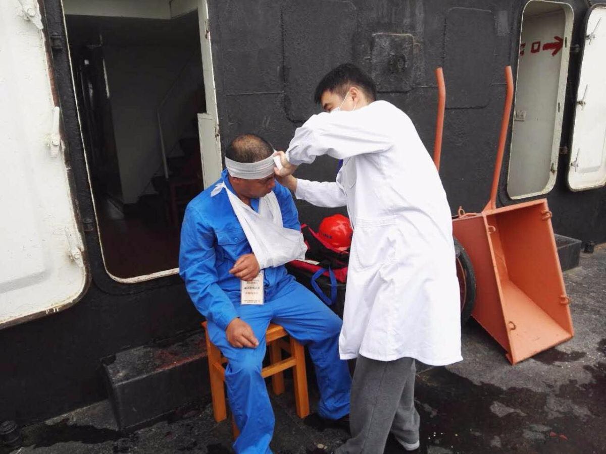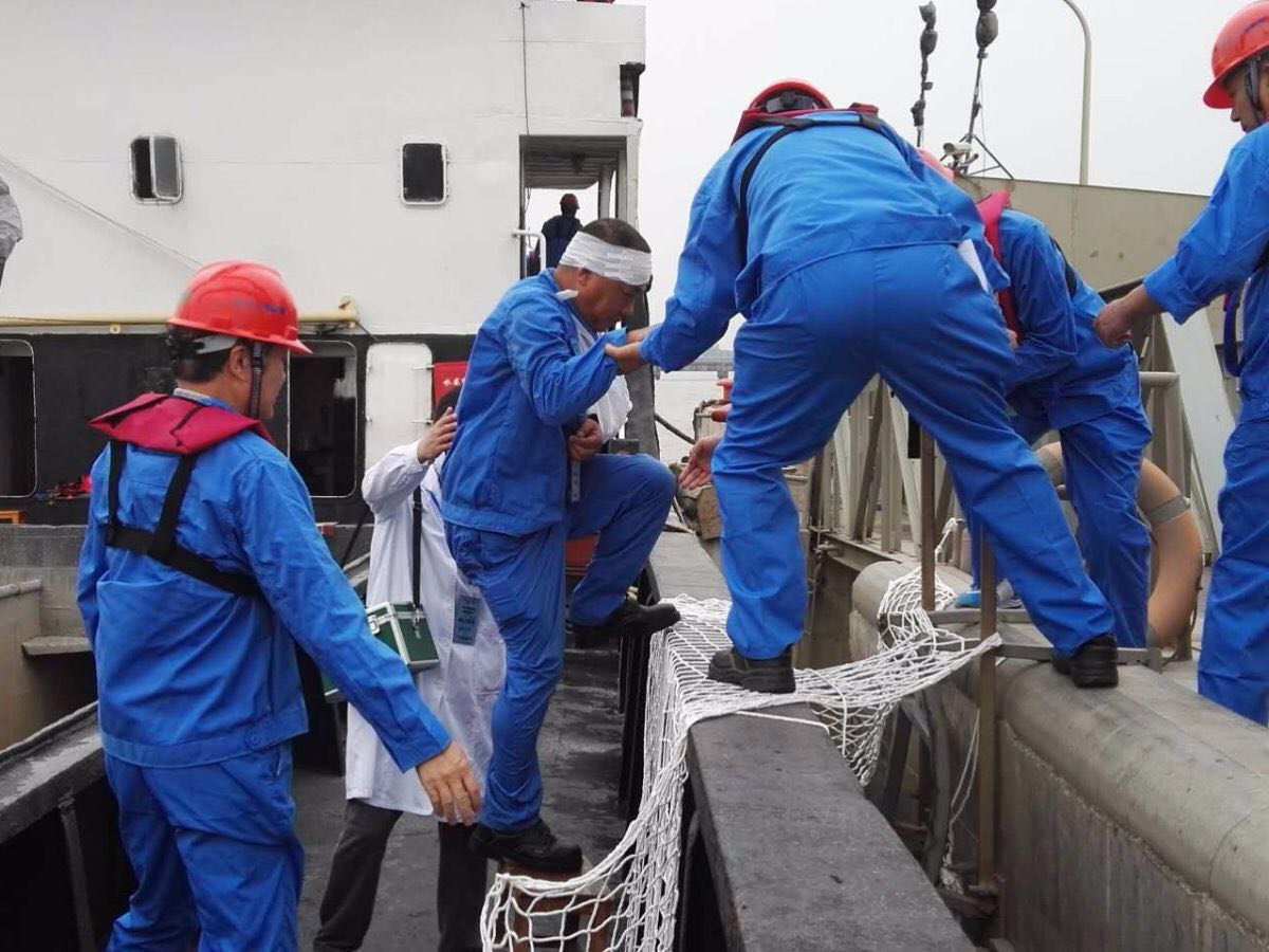 此時(shí),應(yīng)急拖輪“鎮(zhèn)港拖1001”已到達(dá)出事水域,并完成靠泊“百順66”,隨船醫(yī)生立即上船,對船員進(jìn)行包扎急救。