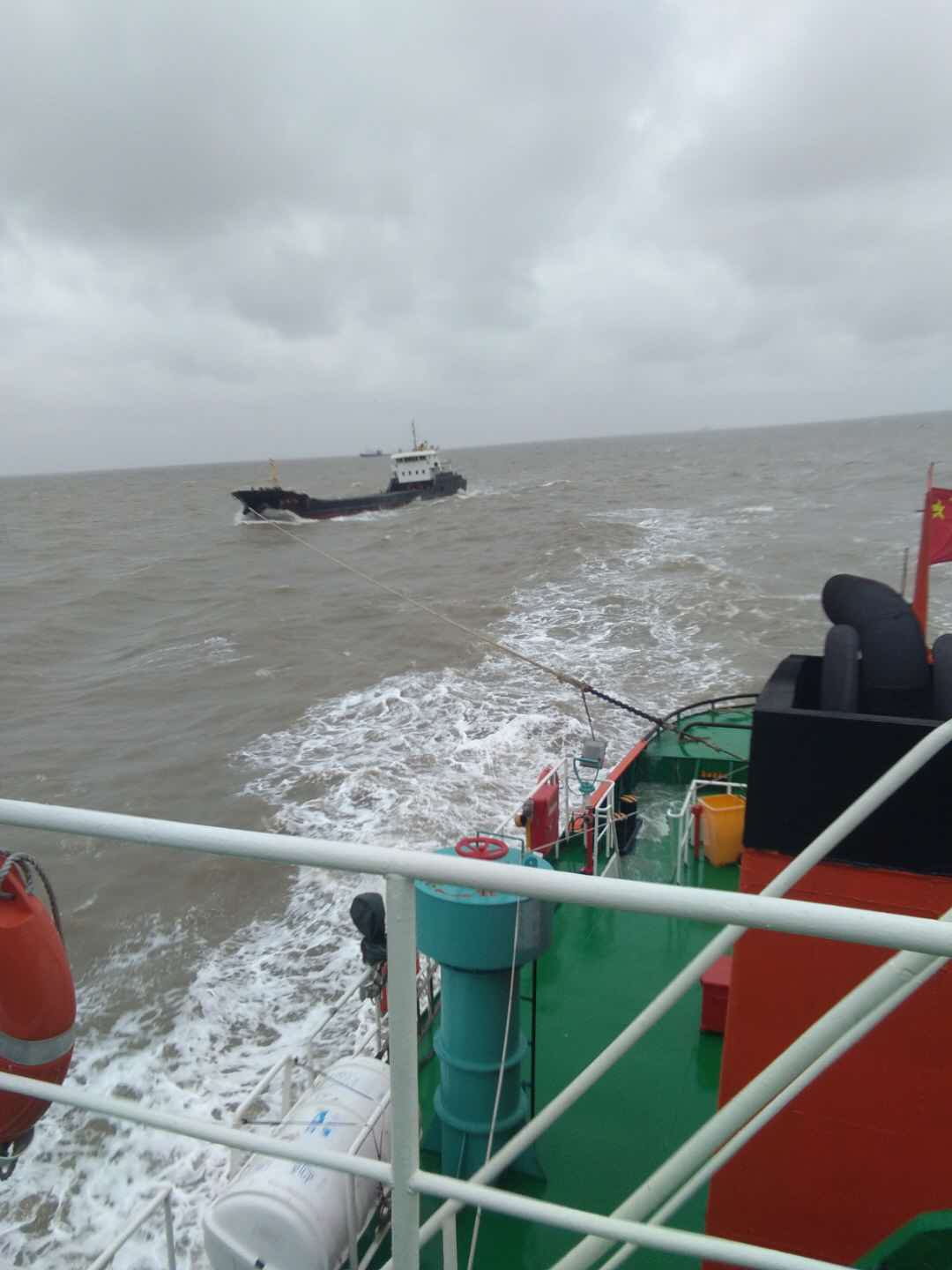 頂著9級(jí)大風(fēng)和3~4米高的大浪,我司“鎮(zhèn)港拖1004”航行致事故現(xiàn)場已是零點(diǎn),因現(xiàn)場風(fēng)大浪急無法進(jìn)行帶纜作業(yè)。我司“鎮(zhèn)港拖1004”船長根據(jù)現(xiàn)場情況和潮汐變化情況,通過高頻電話指揮失控船舶調(diào)整錨位和舵角,使“浙豐7XX”船位處于逐步穩(wěn)定狀態(tài)并安定了遇險(xiǎn)船員的情緒。同時(shí)守護(hù)在失控船舶下游,并隨時(shí)捕捉帶纜良機(jī)。在風(fēng)大浪急的黑夜中,經(jīng)過近十個(gè)小時(shí)的艱難反復(fù)操作,終于借助拋纜器和尼龍拖纜的浮力作用,使主拖纜連接到失控船舶上。